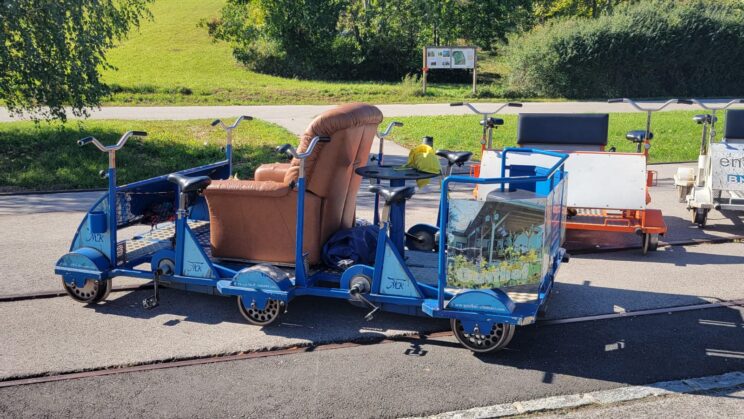 (Eine Draisine ist ein Fahrzeug auf Schienen, das man mit Pedalen bewegt – so ähnlich wie ein Fahrrad, nur dass es auf alten Eisenbahngleisen fährt).