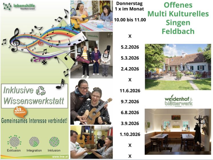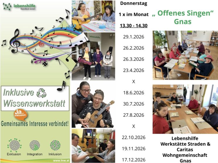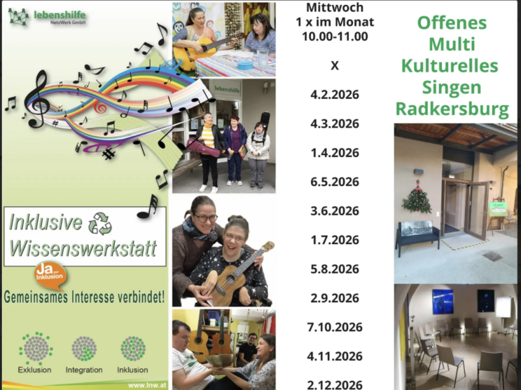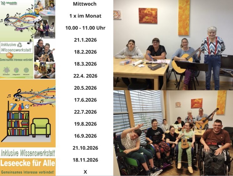 Die Inklusive Wissenswerkstatt ist ein Ort der Begegnung, des Lernens und des gemeinsamen Erlebens. Menschen mit und ohne Behinderung kommen zusammen, tauschen Wissen aus, entdecken Neues und gestalten gemeinsame Aktivitäten. Dabei geht es nicht nur um Bildung, sondern auch um Teilhabe, Kreativität, Musik, Natur, Kultur und ein gutes Miteinander.Auch Musik spielt eine große Rolle. Beim Offenen Singen treffen sich Menschen, die Freude am gemeinsamen Singen haben. Es geht nicht um Perfektion, sondern um Gemeinschaft, Rhythmus, Stimme und Freude. Bekannte Lieder, einfache Texte und musikalische Begleitung machen das gemeinsame Singen für alle zugänglich.Die BIM-Band ist die Bücherei-Band im Mesnerhaus in Straden. Sie verbindet Musik, Begegnung und Inklusion auf besondere Weise. Bei Auftritten in der Bücherei wird sichtbar, wie Musik Menschen zusammenbringt. Die BIM-Band zeigt: Inklusion gelingt dort besonders gut, wo Menschen ihre Fähigkeiten einbringen können und gemeinsam etwas Schönes entsteht.Beim Kräuter-Stammtisch dreht sich alles um Natur, Pflanzen und altes Wissen. Gemeinsam werden Kräuter kennengelernt, verarbeitet und besprochen. Die Teilnehmer*innen können Erfahrungen austauschen, Neues ausprobieren und voneinander lernen. So wird Wissen lebendig und für alle verständlich weitergegeben.Ein wichtiger Kooperationspartner der Inklusiven Wissenswerkstatt ist die Leseecke für Alle. Hier werden Bücher, Geschichten und verschiedene Medien so eingesetzt, dass möglichst viele Menschen daran teilhaben können. Mit Vorlesen, Erzählen, Bildern, Musik oder technischen Hilfsmitteln wie dem Anybook Reader entstehen barrierearme Zugänge zu Sprache, Wissen und Fantasie. Gemeinsam werden Lieder einstudiert und auf den Reader gesungen.Die Inklusive Wissenswerkstatt macht sichtbar: Jeder Mensch bringt etwas Wertvolles mit. Wissen entsteht nicht nur in Büchern oder Schulungen, sondern auch im gemeinsamen Tun, im Erzählen, im Zuhören und im Ausprobieren.Wenn ihr herunterscrollt, findet ihr alle Termine.